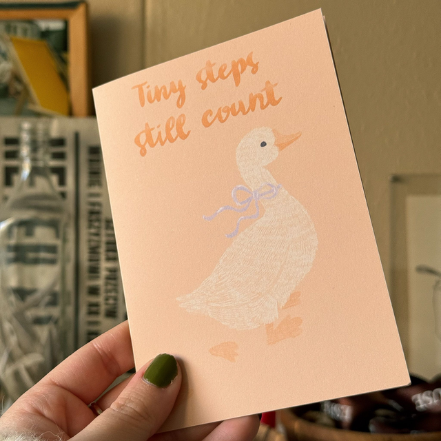 Voor momenten waarop vooruitgang zacht gaat. Deze luxe dubbele wenskaart heeft een pasteloranje illustratie van een eend en de tekst “Tiny steps still count”. Een bemoedigend kaartje voor wie het even nodig heeft.